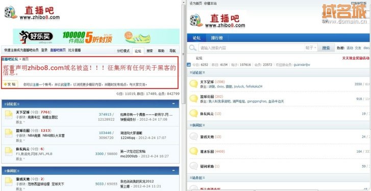![]() 左邊為真直播吧論壇(頁面上刊登了域名zhibo8.com被盜的通告),右邊為假直播吧論壇 對此,域名城CEO王培陛分析到,此類事件已經(jīng)在國內(nèi)以及國際上發(fā)生多起了,在域名城論壇上就已經(jīng)有很多用戶爆出了在國內(nèi)外被盜竊域名的事件。而此次直播吧域名被盜事件無疑給國內(nèi)企業(yè)以及更多的創(chuàng)業(yè)者再次敲響了警鐘。 域名不僅是一個企業(yè)網(wǎng)站的品牌,更是一個企業(yè)網(wǎng)絡(luò)發(fā)展的基石。尤其是域名安全的重要性,我們更加不容忽視。如果域名被他人非法占有,那么后果將不堪設(shè)想,就像此次直播吧域名被盜,不僅給用戶帶來了更多的威脅和不便,也給網(wǎng)站主帶來了巨大的損失。與其亡羊補牢,不如未雨綢繆。 目前直播吧(zhibo8.cc)事件已通過司法途徑處理中,在此我們呼吁有相關(guān)線索的人請聯(lián)系本站或者直播吧官方人員(zhibo8.cc)。對于此事件我們會繼續(xù)做進一步的報道。 |